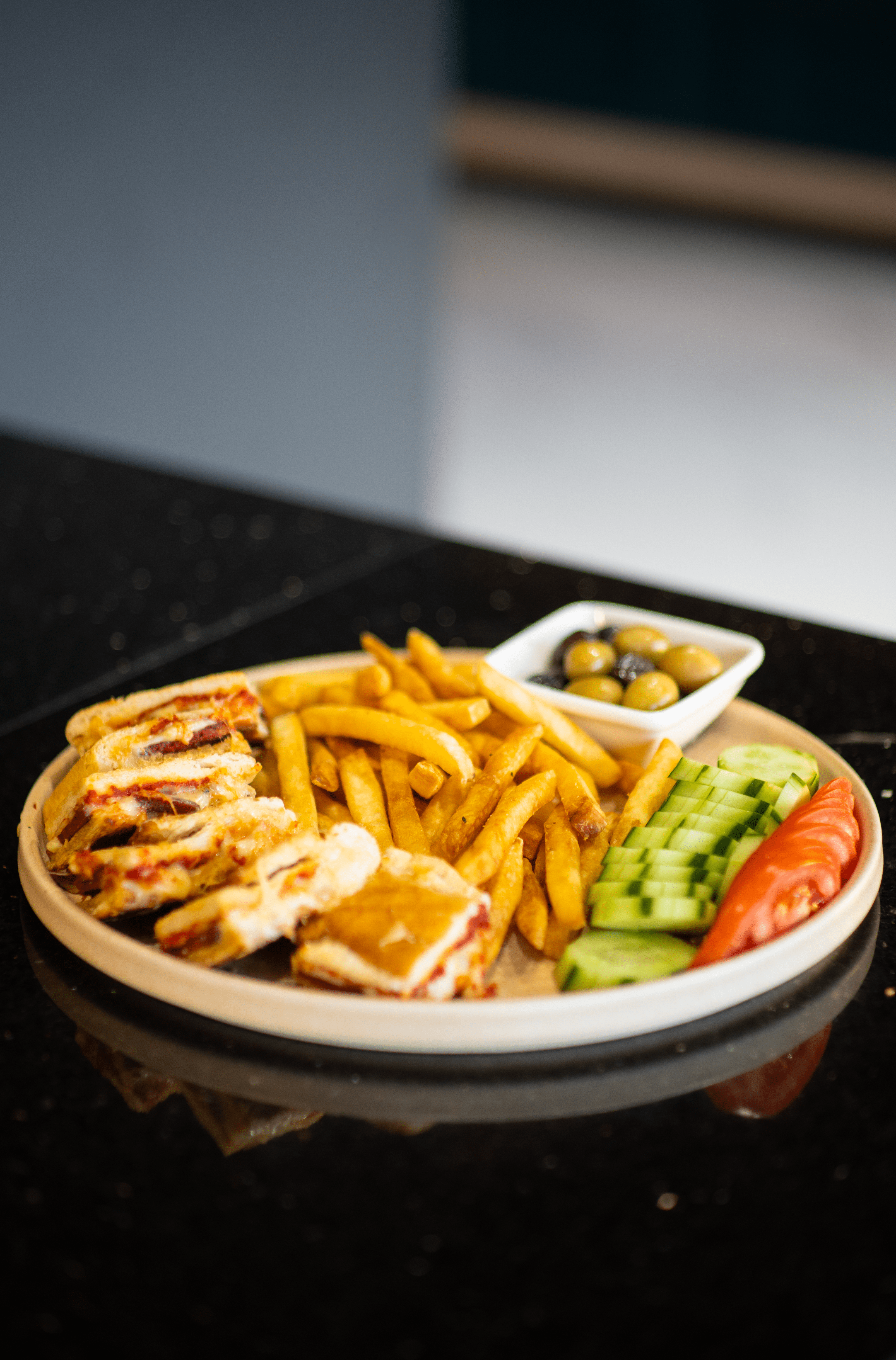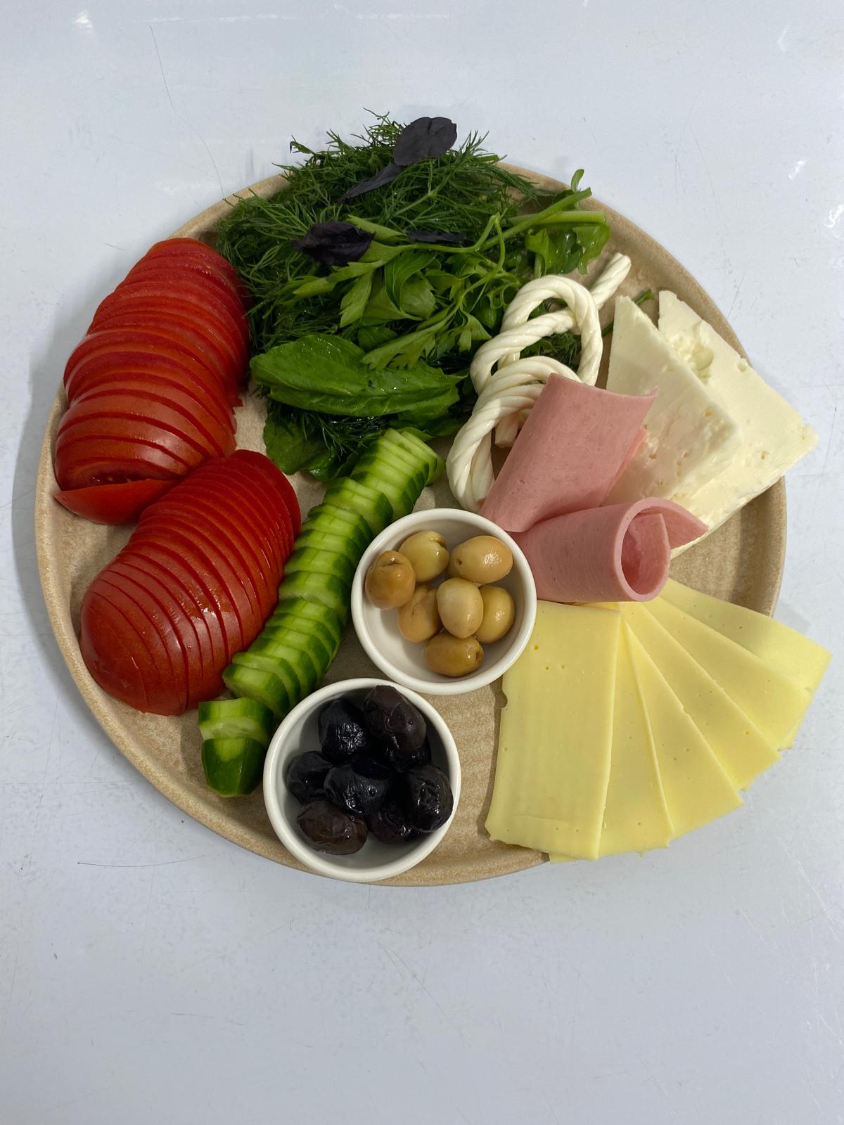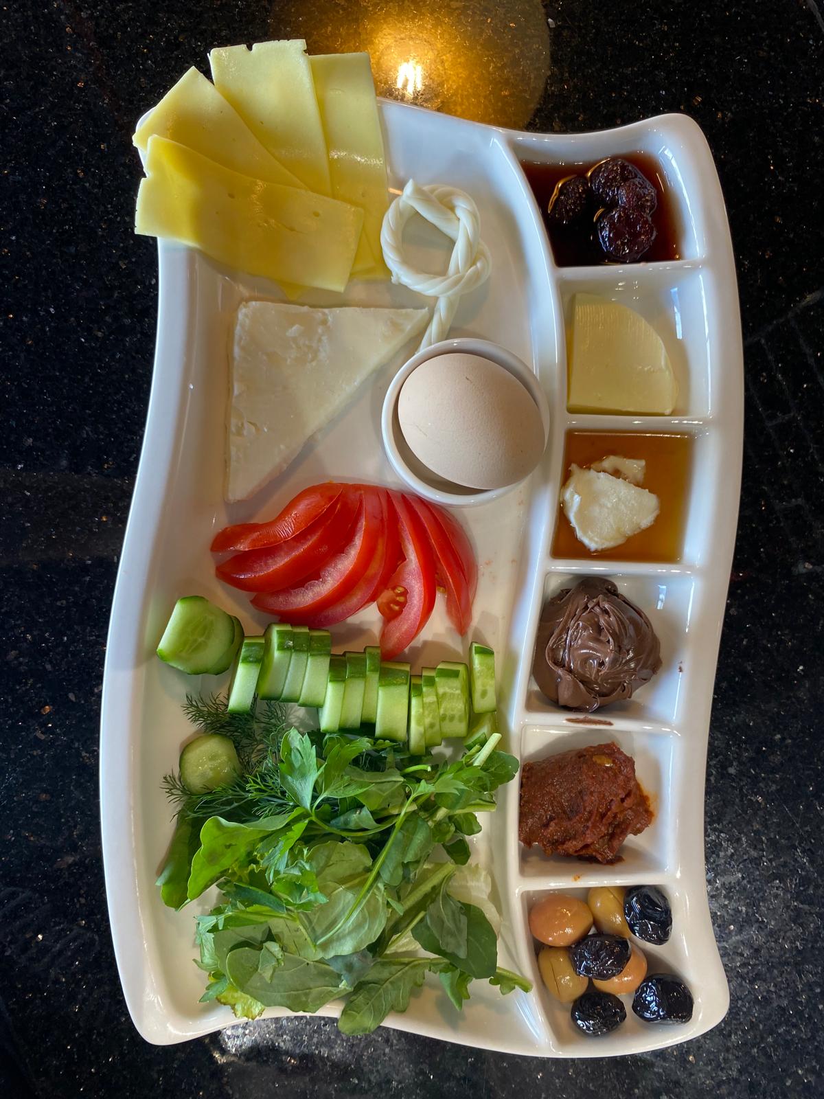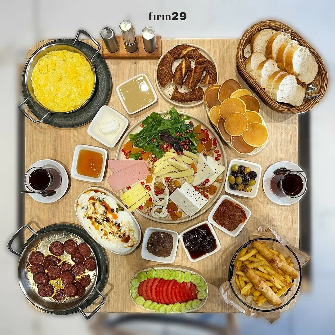 Peynir tabağı, domates, salatalık, zeytin, bal, kaymak, reçel, tahin-pekmez, terayağ, acuka, çikolata, patates kızartması, sigara böreği, pankek, sahanda yumurta, sahanda sucuk, biber borani, yoğurtlu köz patlıcan, simit, pot çay.